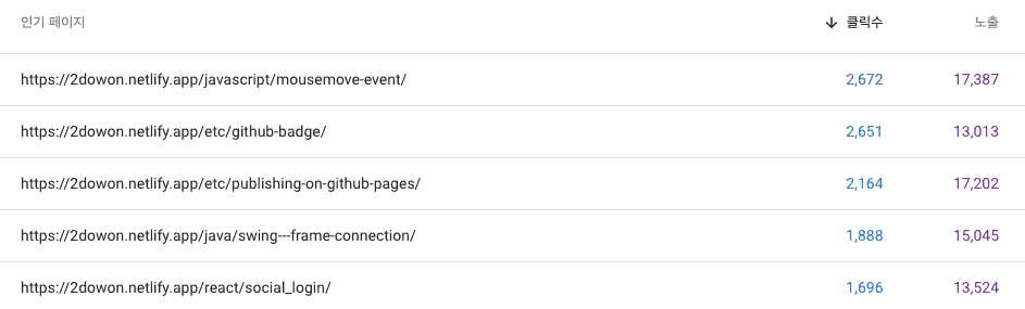 이전 TIL 블로그에 약 2만명의 사람들이 방문했었다. 가끔씩 이 지표를 보는 재미도 꽤 있었다. 사람들이 무슨 글을 많이 보는지, 어떻게 검색해서 들어오는지를 보는 재미가 있었고 내가 특히 열심히 쓴 글이 많이 클릭되어 있으면 기분이 특히 좋았다. 예를 들어서, java swing에 관한 글은 진짜 저 글때문에 블로그를 시작했다고 말할 수 있을 정도로 내가 쓴 글이 많이 도움이 되었으면 좋겠다라는 쓴 글이었다. 저 글도 TOP5안에 든 걸 보면 진심이 통한 기분도 들고 그래서 좋았다. 그래서 이번에 블로그를 아예 바꿔버리면서 새롭게 시작하는 덕분에 이 지표들을 버리고 가서 많이 아쉽긴 하다. 그래도 새 블로그에도 글 자주 올려서 많은 사람들에게 도움이 되는 공간이 되었으면 좋겠다.