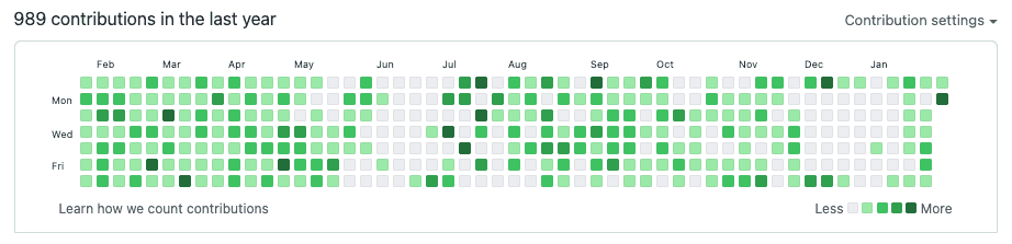 작년 겨울쯤에 일일 커밋을 100일정도 했었는데, 확실히 매일매일 컴퓨터 앞에 앉는 습관도 들고 무엇보다 잔디밭이 푸릇해지는 기분이 아주 좋았다. 그러다가 소마 합격하고 기획 준비하는 한달동안은 멘토링과 기획 위주로 한 덕분에 잔디가 텅 비었고, 취업한 직후에도 한달정도는 퇴근 후에도 피곤해서 커밋을 하지 못했다. 그래서 이렇게 가다가는 일일 커밋을 했던 기간이 지나가버리면 잔디밭이 너무 휑해질꺼 같은 마음에 다시 일일 커밋을 해보자는 마음을 먹었고, 아직까지는 꽤 지키면서 하고 있는 중이다!