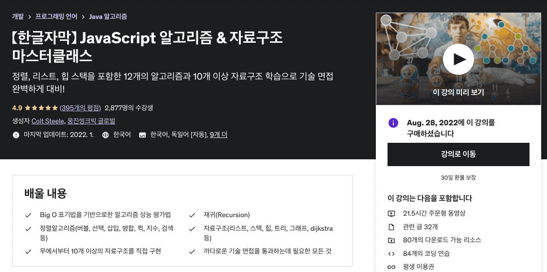 코딩 테스트를 감을 잃지 않으려고 2주에 최소한 5개는 풀 수 있도록 하고 있다. 꾸준히 풀다보니까 예전보다 나아지기는 했는데, 문제가 어려워질수록 기본 알고리즘이나 자료구조에 대한 지식이 너무 없다는 생각과 동시에 Udemy에서 이 강의를 할인하고 있어서 사버렸다. 강의가 길지는 않아서 출퇴근할 때 지하철에서 보면 좋겠다 싶어서 몇번 봤는데, 아침에는 사람이 많아서 정신이 없고 저녁에는 퇴근하자마자 공부하기가 너무 싫어가지고…ㅎㅎ 강의를 아직 많이 못 들었다. 진짜 봐야되는 강의가 너무 많은데… 진짜 모각코라도 구해야하나 싶다. 소마 엑스퍼트 끝나면 시간이 좀 생길려나ㅜㅜ 올해 안에는 가볍게라도 듣고 싶은데 진짜.