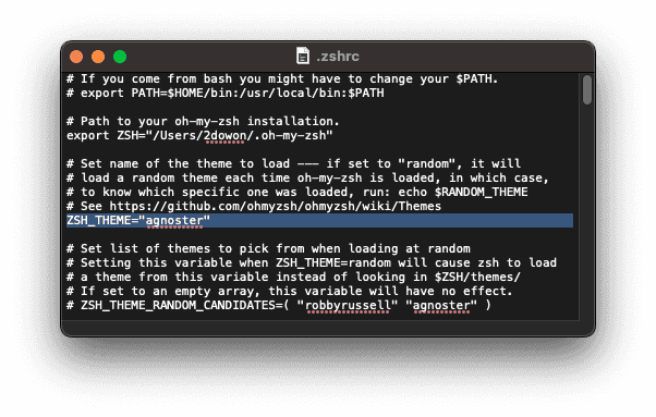 2️⃣ zsh_theme 를 찾아서 수정한다 ⇒ ZSH_THEME="agnoster"
