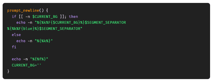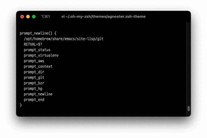 vi ~/.oh-my-zsh/themes/agnoster.zsh-theme2️⃣ build_prompt() 를 찾아서 prompt_newline 을 추가해줘야 하는데 꼭 순서를 지켜서 추가해줘야 한다.