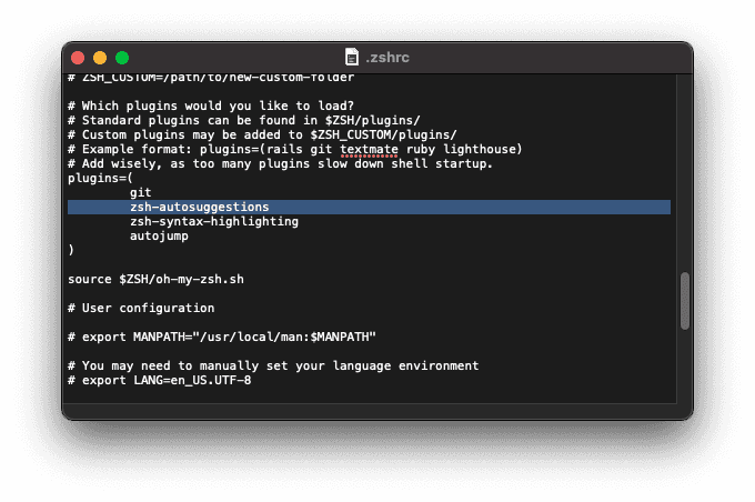 git clone https://github.com/zsh-users/zsh-autosuggestions ${ZSH_CUSTOM:-~/.oh-my-zsh/custom}/plugins/zsh-autosuggestions2️⃣ ~/.zshrc 에 플러그인 경로 추가