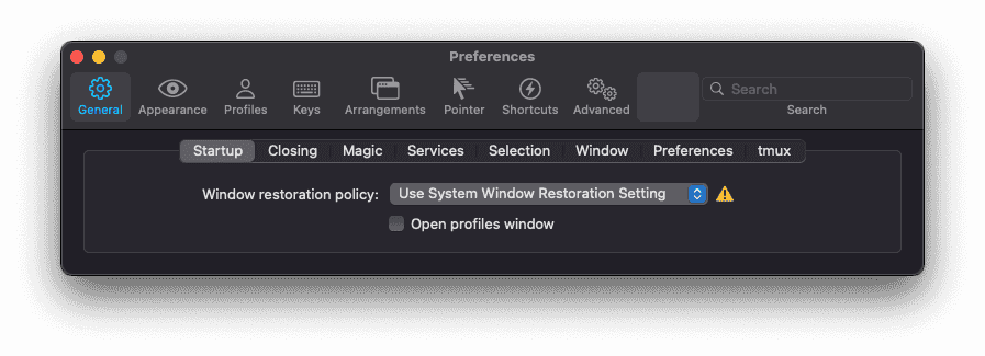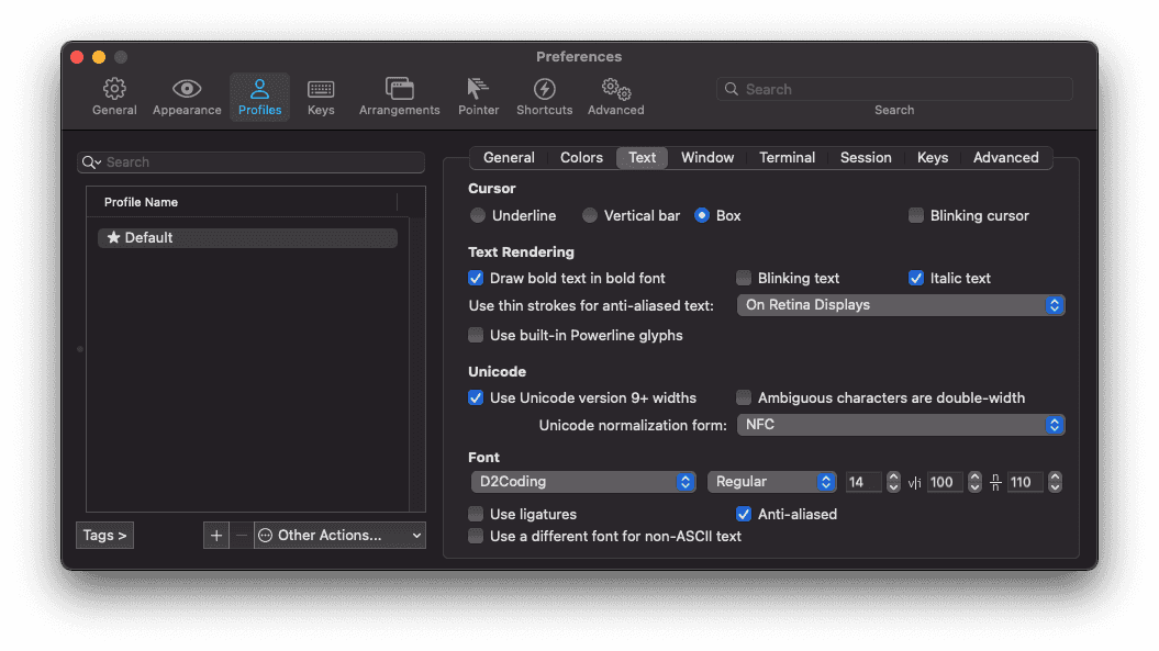 iTerm2의 Preferences에서 설정을 변경할 수 있다. Preferences 단축키는 command 와 , 를 동시에 누르면 된다.