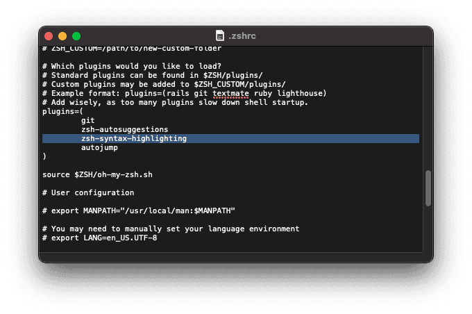 git clone https://github.com/zsh-users/zsh-syntax-highlighting.git ${ZSH_CUSTOM:-~/.oh-my-zsh/custom}/plugins/zsh-syntax-highlighting2️⃣ ~/.zshrc 에 플러그인 경로 추가