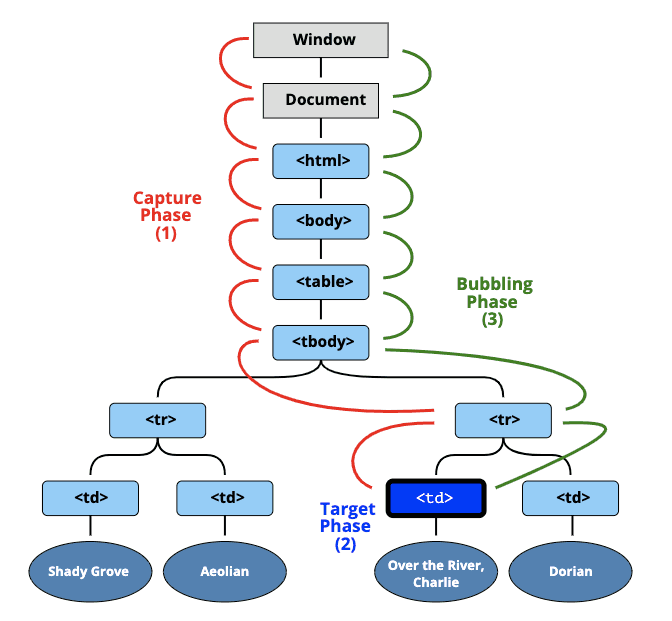 - 아래 그림처럼 td를 클릭하면 이벤트가 최상위 조상인 window에서 시작해 td까지 내려오는데 이를 캡쳐링이라 한다. 그리고 이벤트가 타깃 요소인 td에 도착해 실행을 한 후, 버블링을 통해 다시 위로 올라간다.